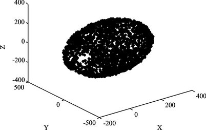 地磁场正常情况下测量到的三维数据在空间上的包络应该是一个标准的圆球。但是磁场计测量出来的数据由于受到外界磁场的影响,加上磁阻传感器各轴的标度因子和非正交度,导致传感器采集到的数据在三维空间内分布的包络面为球心偏移原点的椭球面,磁场裸数据三维分布如图4所示。
