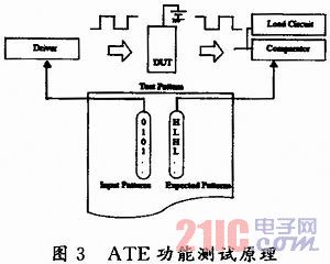 BIST与Scan的测试方式基本相同,都是对芯片输入一测试向量然后比对输出向量的检测。测试向量(pattern)由后端仿真得出的波形产生(WGL,Wave Generation Language)文件转换而来。BIST作为普通功能测试,施加激励,对输出进行判断。虽然Sean测试是结构性测试,但对于ATE而言,其测试方法与功能测试并无区别,只是Scan测试可以较少的测试向量达到较高的测试覆盖率。ATE功能测试原理如图3所示。