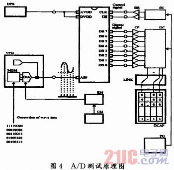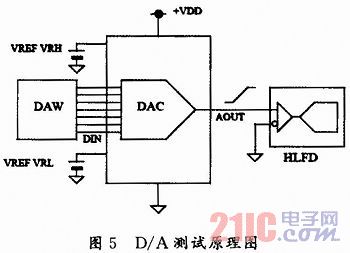 测试开发时用程序编写生成一数字序列作为DAC测试时的输入向量。按照测试方案该数字序列为2.5MHz采样132kHz信号,8比特量化。 ATE按照此向量文件产生8位数字信号作为待测DAC的输入,DUT的模拟输出被ATE的模拟波形采样模块(HLFD)采样。测试程序对HLFD采样结果进行FFT运算得到SNR参数,并由SNR的值判断DUT是否通过DAC测试。其D/A功能测试原理如图5所示。