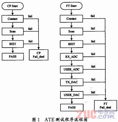 由于集成电路的集成度不断提高,测试的难度和复杂度也越来越高,当前大规模集成电路生产测试已经完全依赖于自动测试设备(Auto matic Test Equipment,ATE)。测试工程师的任务就是根据被测器件(Device Under Test,DUT)的产品规范(Specification)要求制定测试方案(Test Plan),并利用ATE的软、硬件资源对DUT施加激励信号、收集响应,最后将输出响应与预期要得到的信号进行对比或计算得出测试结果,最终判断芯片能否符合最初设计要求以决定出厂或丢弃。测试失效的芯片可收集返回给生产厂家,分析失效原因以提高良率。按照测试方案,将芯片测试分为晶圆测试(中测,也叫CP测试)和封装测试(成测,也叫FT测试)。其中FT测试也是就芯片成品的最后一次测试,用来保证芯片的出厂品质;而CP测试主要是在芯片量产初期,晶圆良率不高时,为了减少对失效芯片进行封装的费用而进行的测试,同时CP测试的结果还可以反馈给晶圆厂家进行工艺调整,以提高良率。其ATE的测试程序流程图如图1所示。