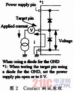 利用被测管脚与地之间的二极管进行连接性测试。施加电流使二极管导通,正常连接时管脚上的电压值应为二极管管压降。如图2所示。其管脚与电源之间的连接性测试原理与此相同。