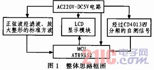 本系统采用AT89S52单片机作为控制核心,把经处理的被测信号(单片机30脚输出经CD4013分频的自测信号)给单片机(P3.4端),再由单片机处理,通过LCD显示模块显示测得的频率值,所有的系统均由AC220V-DC5V底纹波电源模块供电。整体设计思路可用框图1表示,该设计包括4大模块:1)系统控制模块;2)低纹波电源模块;3)分频自测模块(外界信号采集模块);4)液晶显示模块。