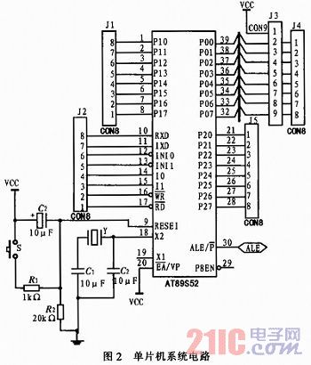 系统控制采用的是一种高性能低功耗的工艺制造的8位CMOS微控制器AT89S52单片机,它提供下列标准特征:4K字节的程序存储器,128字节的RAM,32条I/O线,2个16位定时器/计数器,一个5中断源两个优先级的中断结构,一个双工的串行口,片上振荡器和时钟电路,单片机系统电路如图2所示。