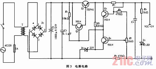 本系统电源完全采用220 V交流电,经过二极管桥式整流和电容滤波,再由9014和TOP46协同确保较大且稳定的电流。由R2、D2、Q4等确保5 V电压,并且系统内部有过流保护,保证输出电流不会超过最大允许值。输出电流达到允许的最大值,它就会自动减小输出电流。它内部有工作区限制,使稳压器的工作不进入非安全区(输出管的管压降和输出电流小于规定值)。最终输出波纹小于4 MV的5 V电压,确保了在测试频率时不受电源的影响,电源电路如图3所示。