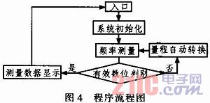 根据设计原理其工作过程就是直接用十进制数字显示被测信号频率的一种测量方法。为了做到测试和读数方便,本设计让其做到自动换挡,即在每个档位(Hz、kHz)端设计了一个标准频率(如100Hz)。在对信号测量时,直接由单片机采样并与标准频率相比较,划分档位区间,在输出显示。本设计中主要程序流程如图4所示。