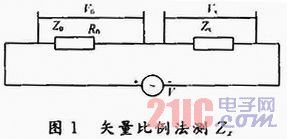 系统采用矢量比例法测量RLC的方法,如图1所示。图中参考阻抗用标准阻抗R0代替Z0,可推导出: