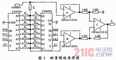 测量模块是待测元件与标准R0分压部分,主要包括减法电路求Vx、减法求V0电路以及标准电阻R0选择电路,如图4所示。由于图2中的Vx不便直接测量,所以通过减法电路来求Vx。当图4减法电路求得Vx的同时,也引入了新的环境变量,因此,使V0也通过相同的电路环境以减小系统误差。可以分析得出,当图1中Vx/V0为1:1时测量精度最高,所以需要调整R0与待测元件的分压接近1:1来保证测量精度。标准电阻R0