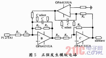 图中电路实质是双二次带通滤波器,它的特点是调整过程十分简单,增益由改变R1调整,Q由改变R2调节,而改变R3则影响输出频率。单片机输出方波信号从图5中R1输入后,经双二次带通滤波器滤波后输出正弦信号。系统通过单片机控制的双刀双掷模拟开关CD4052选择不同的电容C来实现测量频率的自动切换。此外,为了减小温度影响,电路中R1,R2,R3采用由正负温度系数电阻按一定比例串联的温度补偿设计。