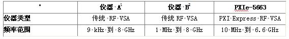 为了展示PXIe-5663 RF矢量信号分析仪的测量速度和精度,我们与一款行业领先的传统仪器进行了一次巅峰对决(如表1所示)。比对试验所使用的两个传统仪器均为较新的RF矢量信号分析仪(Vector signal analyzers, VSA),并且其价格比一个完整的PXIe-5663 RF测试系统要高出许多。