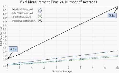 在图9中你可以看到,对于一些测量来说,在达到相同的测量结果时,PXI RF仪器可以比传统仪器快30倍。此外,在一些需要更多的平均次数的测量中,PXI仪器在绝对的测量时间上的优势更为显著。