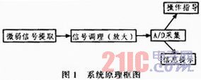 一般信号在使用前,需要先滤波后放大,或者先放大后滤波,然后经过A/D等手段获取(感知)信号。对于小信号而言,信号幅值只有几毫伏,甚至更小,如果先滤波,可能会将有用信号滤除,因此,在这种情况下,需要先进行放大,然后滤波,再进行A/D转换或其他处理。根据本系统特点,系统中存在的干扰可以忽略,因此不考虑信号滤波环节,因此,系统主要通过信号提取、信号放大、A/D采集3个重要环节实现。第3个环节产生的数据,可以指导人们的工作,或显示相关的信息。整个系统原理框图如图1所示。