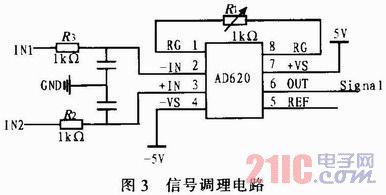 调理后的信号经过AD620的6脚输出,此时可直接接入A/D转换芯片,实现数据采集,使用时缩小相应倍数即可。信号调理原理如图3所示。