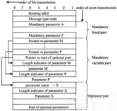 ●Optional part:可选部分参数是指那些在消息中定义了的可能出现也可能不出现的参数,整个可选部分的起始位置由必备可变部分参数的最后一个指针来指明,该指针指示的是可选部分第一个参数开始位置的指针。如果消息类型指示没有可选部分参数存在,那么这个指针将不存在,如果消息类型指示有可选部分存在,但对于一条具体消息时并不包含这些可选参数,那么该指针所在字段应该全为0。可选部分可以包含固定长度参数或者可变长度参数。另外,可选部分参数在消息中的发送顺序是不受限制的,比如一条SCCP消息3个可选部分参数,这3个参数出现的顺序和协