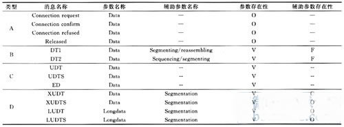 表3中有两列内容分别是辅助参数和它们的存在性。辅助参数是指在相应消息中对于获取SDU有帮助的参数,而存在性就表示该辅助参数在相应消息中的存在可能,F和V表示一定存在,0表示可能存在。辅助参数的作用主要是用来告知消息中包含的Data是完整的还是需要分段传送的,如果完整,那么取得数据后函数就把PDU数据返回;否则要对来自多条SCCP消息的多个Data进行组装。在表3中用A,B,C,D对消息处理进行了分类,每个类型代表一种处理的复杂程度如表4所示。
