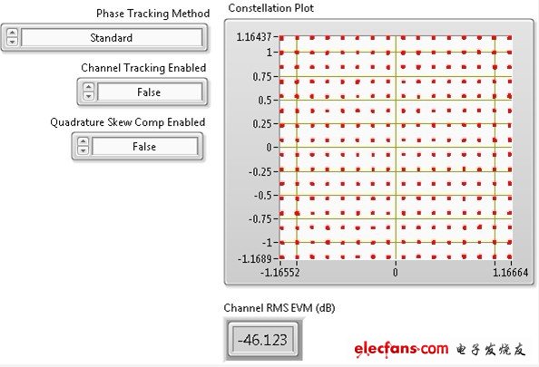 WLAN分析工具包也可以补偿由于发生器/DUT引起的相位偏移。图11显示了带正交偏移的信号。正交偏移补偿最适用于带大量点的调制方式(如256 QAM)。