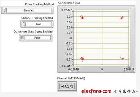 图9. 上图显示了80 MHz 802.11ac信号进行相位跟踪对EVM数的影响。该图表在256-QAM信号图中仅显示了4个符号。