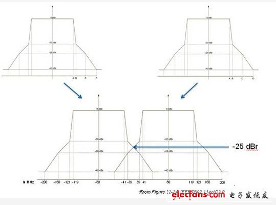 802.11ac要求强制80 MHz频谱屏蔽测试。可选项也包括80+80 MHz和160 MHz频谱屏蔽测试。80 MHz段可以为连续或非连续(在不同波段中)。
