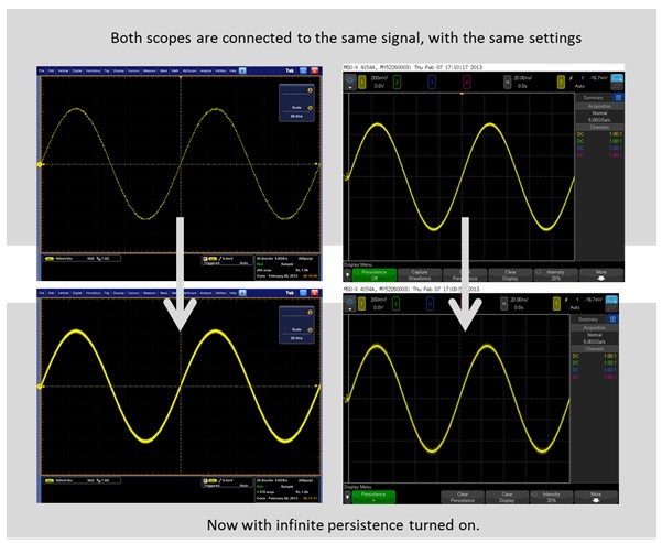 开启无限余辉并等待 10 秒。两款示波器显示同样粗细的波形。安捷伦示波器的更新速率为 100 万个波形/秒,而 Tek 示波器在常规模式下的更新速率仅为 60 个波形/秒。波形粗细与示波器向初始信号中添加的噪声数量有关。
