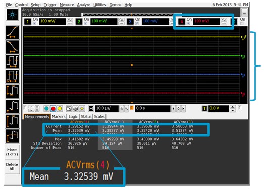 图 3. 快速表征示波器的噪声。断开所有输入端。针对每个垂直设置中的通道进行 Vrms AC 测量。