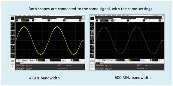 图 2. 更新速率相同的两款示波器连接到同一个信号。两者所显示的波形粗细大为不同。原因何在?4 GHz 示波器的噪声高于 500 MHz 示波器。粗细不同的原因在于噪声。