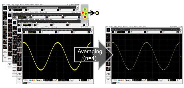 平均值模式一般通过降低噪声使波形变细。平均值模式可使示波器进行连续采集,对每个已捕获的点求平均值,如图 5 所示。这种方法通过多次采集求取噪声平均值,能够降低示波器整体噪声。平均值权衡包括:平均值法还会求取目标信号值的平均值,并且仅针对重复信号。