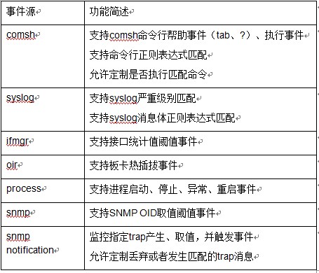 嵌入式自动化技术主要是对设备内部事件进行监控,事件发生时执行用户定义策略。针对一些特定类型的故障,通过嵌入式自动化技术,维护人员可以预先定义故障处理的方法,一旦发生该类故障,设备自动执行预先定义好的故障处理策略,从而提高故障处理的效率。下文主要以H3C RTM(Real-Time event Manager)技术为例进行说明。