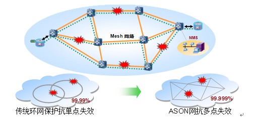 具备ASON智能特性的MSTP设备支持MESH组网,具有永久1+1保护和自动恢复的能力,在多重故障的情况下,业务仍然不受影响,极大地提高了网络的安全性,业务可靠性可达到5个9(99.999%)以上。