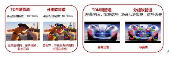 硬管道技术普遍提供线路接口的前向纠错能力(FEC),当前解决方案可对低于10E-3的误码进行纠错,这一特性除可以提升传送距离外,还可以对系统劣化情况下的误码进行纠错,实验表明FEC可以大大提升视频等业务在专线系统的承载体验。弹性管道系统一般缺乏FEC能力,在高质量的视频业务传送上存在技术不足。