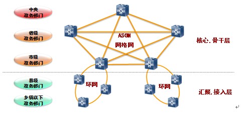 采用MSTP硬管道技术的传送网络可根据不同规模及可靠性要求采取对应的组网结构,较大规模的采用骨干、汇聚和接入三层组网,对规模较小的政务网采用核心+接入两层组网;同时,在核心层利用冗余光缆资源组成网状网,开启ASON功能。在接入层组成环网,为业务提供光纤路由保护。