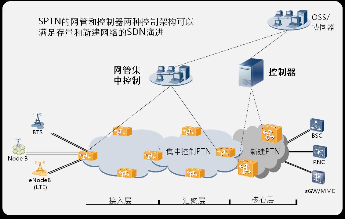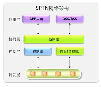 为了适应未来移动承载网络的发展,华为提出了SPTN的解决方案,其中的“Soft”即是以SDN为核心的软网络演进。针对SDN的网络架构,SPTN在ONF的三层架构上,融合业界观点,开创性地提出了四层架构,即设备转发层、控制层、协同层和应用层。通过协同层的引入,可以更好地对多个控制器进行业务协同,更有利于实现诸如网管控制和控制器控制间的协同、网络多层(L0/L1/L2/L3层)间业务协同以及多厂商控制器间协同等,给运营商带来更大的价值。