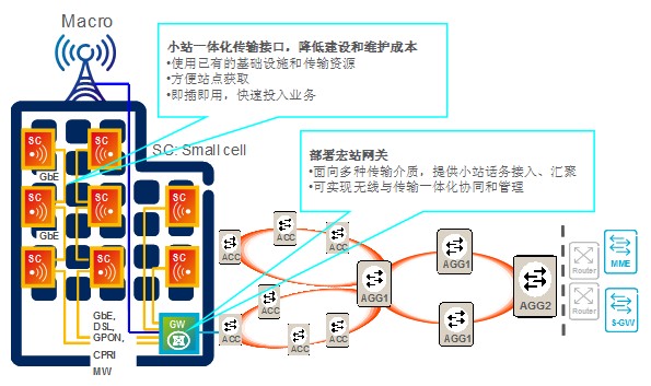小基站回传最后一公里可分为有线和无线两种场景:无线场景可用于在没有线缆资源或难以铺设线缆的室外小蜂窝的回传,根据站点情况采用视距(LOS) 或非视距(NLOS) 微波设备;有线场景则可采用宏站内置的具有多种媒介接入能力的接入网关设备(Radio Access Gateway)或板卡,采用多种传输介质和技术(如VDSL,FTTx),将小基站话务先汇聚到宏基站,再由已部署到宏基站的回传网络实现向核心网的传输(如下图所示)。该方案可充分保证保证小基站传输接口与宏站网关的互通性和可管理性, 达到宏站和小基站的统一协调和管理,具有维护界面清晰和对已有基于宏站的回传网络架构无任何冲击的优势。
