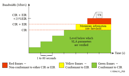测试流分6步阶梯式模拟不同速率的业务流测试出CIR、EIR是否正确,测试时间可配置、测试流采用单一帧长流或者混合帧长流可配置。时延、抖动、丢包率利用对端智能环回技术环回业务测试流实现。