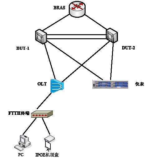 本测试分为设备基本能力测试、虚拟化能力测试和现场业务测试三个部分,测试选取市区中心局节点作为测试端点,本次测试的实际拓扑图如下: