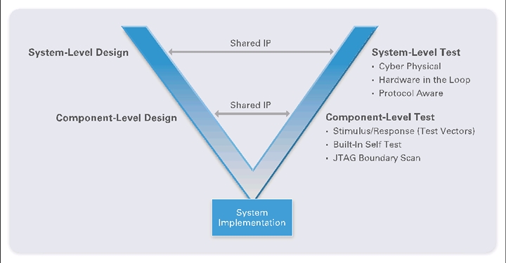 图1. "V"框图通常用于说明设计、实现和测试的理想流程。将通用系统设计语言用于跨越整个"V"流程可以最大化技能和算法重用,同时可以最小化转换错误和查找修正周期数。