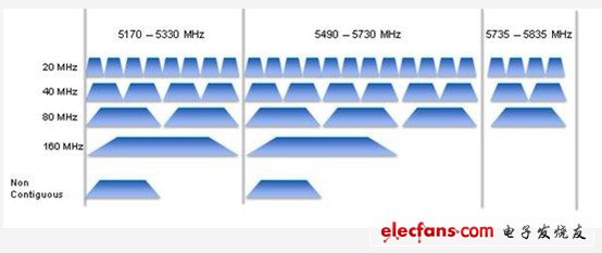 802.11ac可支持5 GHz波段并强制包括20、40和80 MHz带宽。支持160 MHz当前为可选项。可选项还包括非连续80+80 MHz TX和RX带宽。