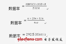 以下步骤可用于计算下列配置的数据率:80 MHz带宽、带800 ns保护间隔的64-QAM信号以及一条空间流。基本上有234数据载波(242—8导频)。符号率计算方式如下:256/80 MHz + 800 ns (GI)。将数值代入数据率公式可得: