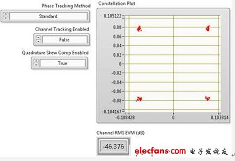 WLAN分析工具包也可以补偿由于发生器/DUT引起的相位偏移。图11显示了带正交偏移的信号。正交偏移补偿最适用于带大量点的调制方式(如256 QAM)。