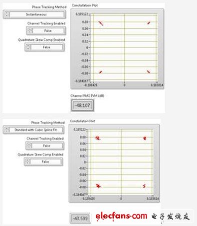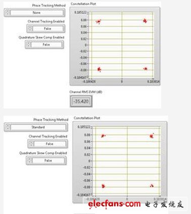 图9. 上图显示了80 MHz 802.11ac信号进行相位跟踪对EVM数的影响。该图表在256-QAM信号图中仅显示了4个符号。