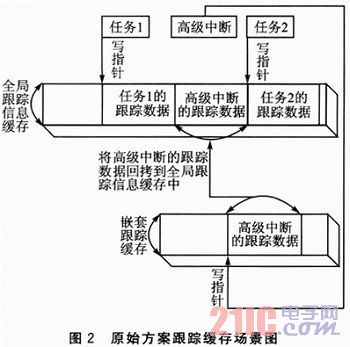 ②缓存管理方面,原始跟踪方案采用嵌套缓存,高优先级任务的跟踪信息写入嵌套缓存中,当需要输出跟踪信息时,需要将嵌套缓存中的数据回拷到全局跟踪信息缓存,在回拷的过程中白白地消耗了处理器的时间。而新跟踪缓存中,将所有的跟踪信息全部存储到一个缓存中,直接将跟踪信息输出,节省了回拷过程的时间,从而为处理器处理其他事件提高了效率。