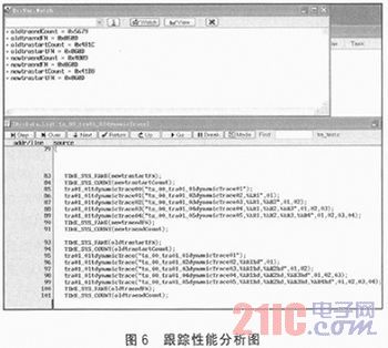 跟踪性能分析图如图6所示,在原始跟踪方案中调用5次跟踪接口打印字符串”ts_00_tra01_01tdynamicTrace01”及相应个数的变量的值,跟踪信息消耗的时间为T_old=(0x5679-0x481C)×(1/0x7800)=0.119 7 ms。在新跟踪方案中,同样调用5次新跟踪方案,跟踪接口打印同样字符串的内容及相应个数的变量的值,跟踪信息消耗的时间为T_new=(0x4809-0x4188)×(1/0x7800)=0.052 6 ms。由此可见,T_old的消耗时间大约是T_new的2倍,新跟踪方案节省了一半以上的时间,然后又多次对各种跟踪接口进行验证、测试、对比后,再次确认了新跟踪方案对ARM的执行效率有很大的提高。