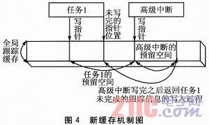 本设计方案采用的缓存机制是利用所有跟踪函数在进入跟踪时,均能够确切知道当前跟踪信息所需存储空间长度的特点,为当前跟踪信息预留出所需要的存储空间。当低优先级任务的跟踪信息被高优先级任务跟踪信息抢占时,内存中已经为低优先级任务的跟踪信息预留了存储空间,不会导致跟踪信息丢失和错乱的情况,新缓存机制图如图4所示。
