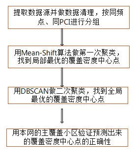以基站采集到的终端测量报告作为数据源,并将数据源按频点和PCI(Physical Cell Identifier,物理小区标识)进行分组,对分组后的每组数据用Mean-Shift(偏移均值向量算法)算法做首次密度聚类[3-4],找到局部最优的基站覆盖中心点。结合专业的业务背景知识,对局部基站覆盖中心点用DBSCAN算法做二次聚类,找到全局最优的基站覆盖中心点[5-8]。最后用本网的主覆盖小区来验证所预测出来的基站覆盖中心点的正确性。具体流程如图1所示: