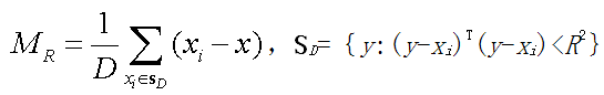 Mean-Shift算法是一个迭代的过程。对于d维空间的N个样本点,首先随机选择一个点,并以这个点为圆心、以R为半径做一个d维的高维球,落在这个球内的所有样本点和圆心都会产生一个向量,每个向量都以圆心为起点、以球内的样本点为终点,计算出球内所有向量的和,最终得出Mean-Shift向量。再以Mean-Shift向量的终点为圆心重复上述步骤。由同起点向量求和法则可知,Mean-shift向量最终将收敛到概率密度最大的区域[9]。Mean-Shift向量的基本形式如下: