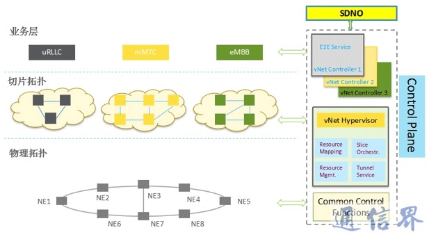 图1中的切片控制器vNet Hypervisor,是实现网络切片的一种特殊的SDN Controller,负责vNet虚拟资源到物理资源的映射、vNet创建管理。业务层的控制器vNet Controller是vNet资源的使用者,只能看到分配给自己的vNet资源,可以在自己的vNet上创建各种业务(如L2VPN、L3VPN),并负责业务生命周期控制。每个vNet对应一个独立的vNet Controller,支持vNet间控制面和管理面的隔离。Common Control Function是通用SDN控制器的主要组件,当不需要网络虚拟化时,此组件可直接控制物理网络。而SDNO负责 vNet Hypervisor上的切片编排策略、vNet的生命周期控制。