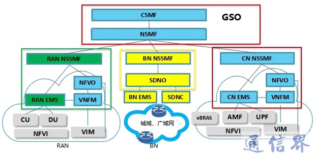 RAN、核心网、承载网三者之间的协同通过基于SDN/NFV架构的切片编排器完成,如图2所示。其中,SDNO负责承载切片编排,并通过SDNC完成承载切片布署。而Global Orchestrator(GSO)完成无线和承载之间跨域的业务协调和编排, 可同时协调CN子切片管理(CN NSSMF)、RAN子切片管理(RAN NSSMF) 和承载网子切片管理(BN NSSMF), 从而实现5G业务的端到端切片,并通过各切片的不同功能属性满足5G业务的差异化需求。