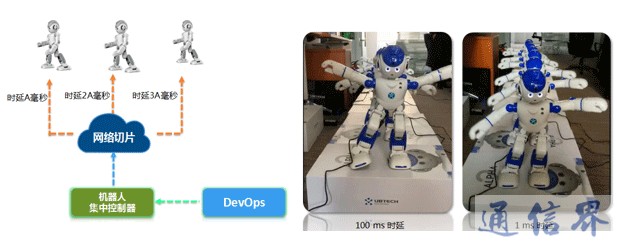 图4为8个机器人模拟工业控制的场景,机器人是以串行方式控制的。 第一个机器人接收到命令后,开始跳舞,并通过网络切片将此命令发送给第二个机器人,以此类推,因此最后的一个机器人的跳舞动作要比第一个机器人慢7倍的网络切片时延时间。 如图4左侧所示。