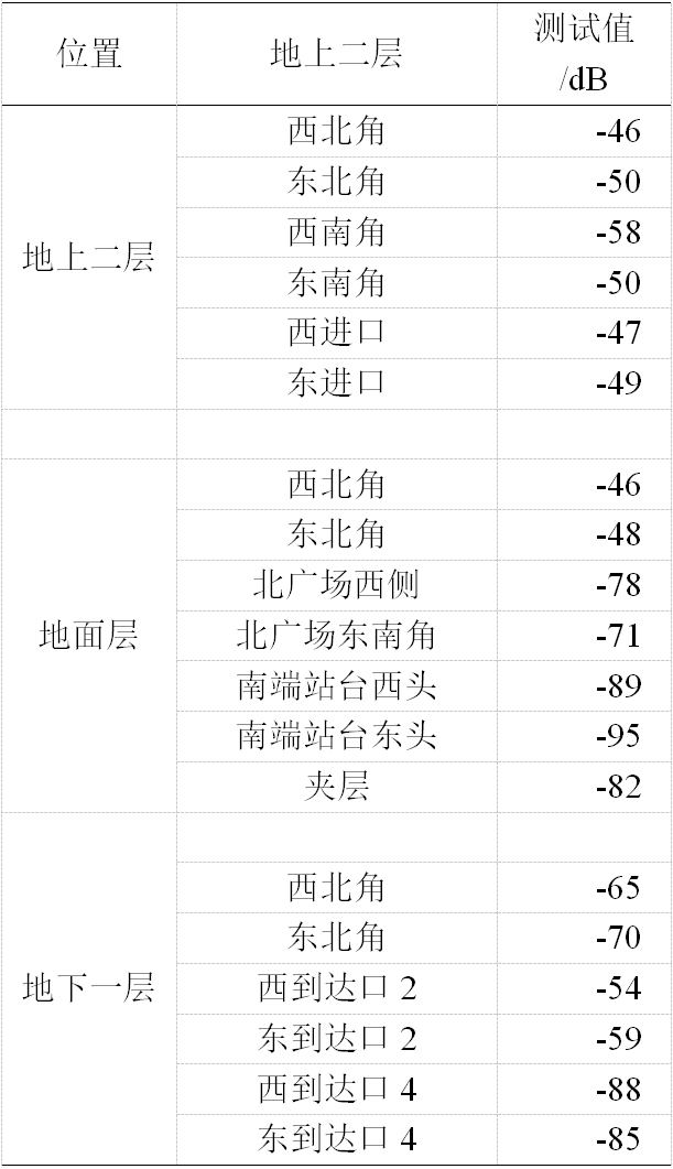 首先确定系统覆盖范围应涵盖整个交通枢纽,根据合肥南高铁站建筑设计图,了解到地上二层空间较为空旷,无线电信号传输过程中遮挡物较少,信号衰减程度较小;地面层空间较为空旷,信号传输问题不大;地下一层各个轨道间遮挡物如支柱楼梯马道较多,信号衰减较为严重。架设一根天线于地上二层的中部偏北,用于二层及地面层偏北区域,又架设两根天线于地面层和地下一层中部,信号的覆盖可以满足全站内的使用。实际电测数据如表1所示: