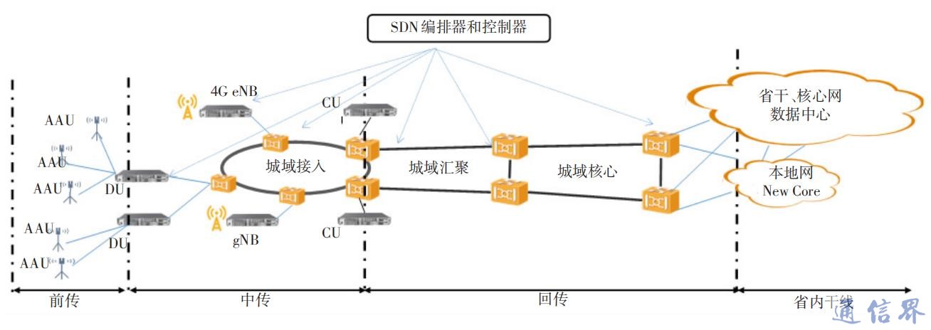 对于中传和回传网络,NSA、SA、专线、固定网络和数据中心互连都应得到支持,包括2G/3G/4G/5G无线服务、企业专线(FE/GE/10GE等)、固定网络服务和数据中心互连等。中传/回传网络的规模可能从数百个节点到非常大量的节点,大型中传和回传网络需要支持分组/IP功能,并且支持网络切片、与5G网络的协同管控等。