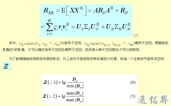 对协方差矩阵RXX进行特征分解,分离出P个较大的特征值所对应的特征矢量构成信号子空间US,和其余M-P个特征值所对应的特征矢量构成噪声空间UN[27]。