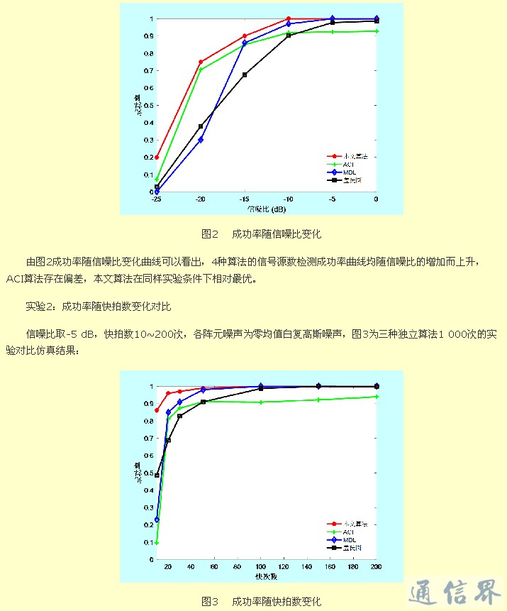 由图3成功率随快拍次数变化曲线可以看出,4种算法的信号源数检测成功率曲线均随快拍数的增加而上升,依然是ACI算法存在偏差,本文算法在同样实验条件下相对最优。